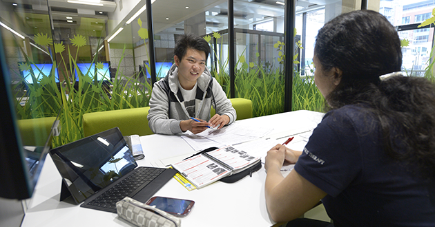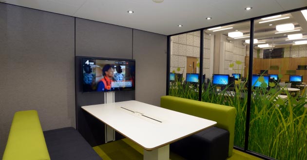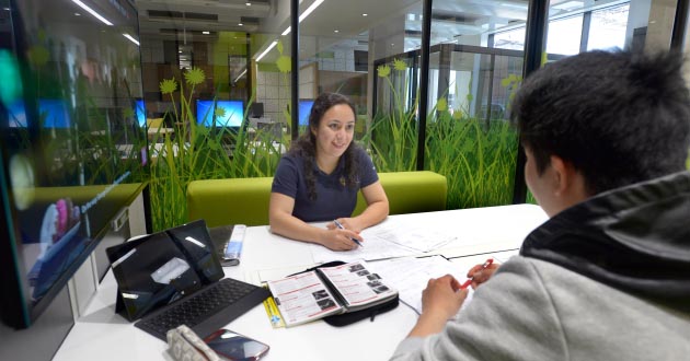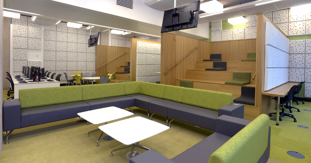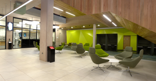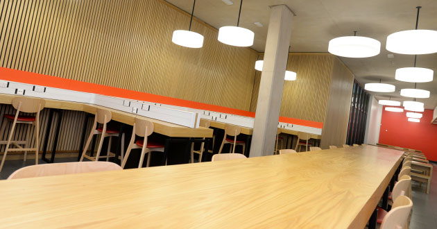 With a bold colour scheme, ThinkSpace, on the ground floor, has glazed study pods for group work such as presentation preparation and project planning.