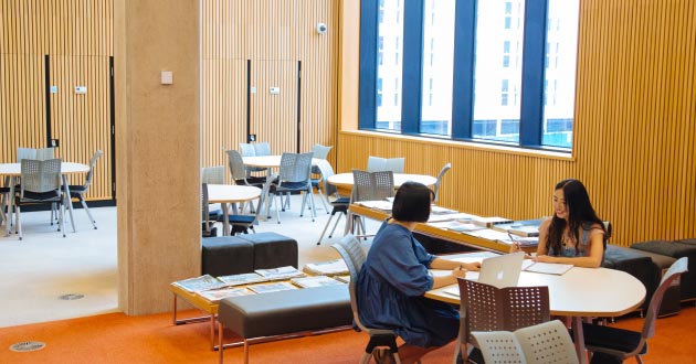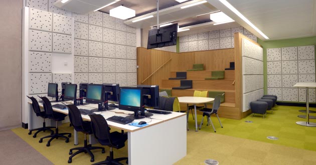 There are also seminar rooms, comfortable tutorial studies, private meeting rooms and social learning spaces with specially-equipped pods with audio visual capability.
