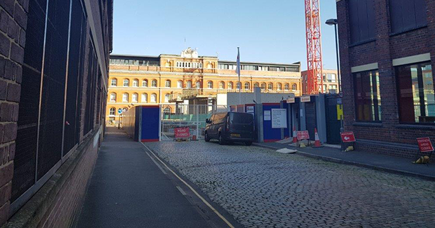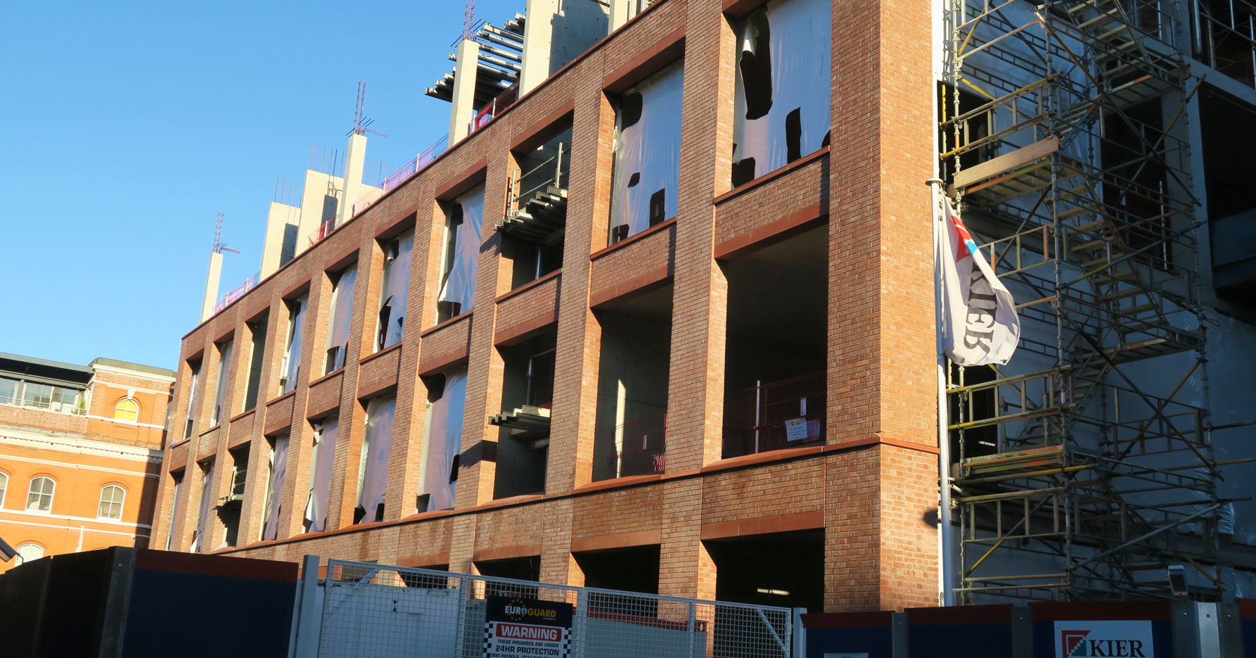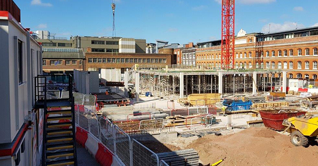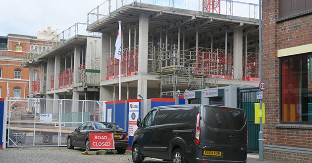 February 2019: Contractors discuss next stages of the build as external façade gets underway – looking out at St Paul’s Church.
