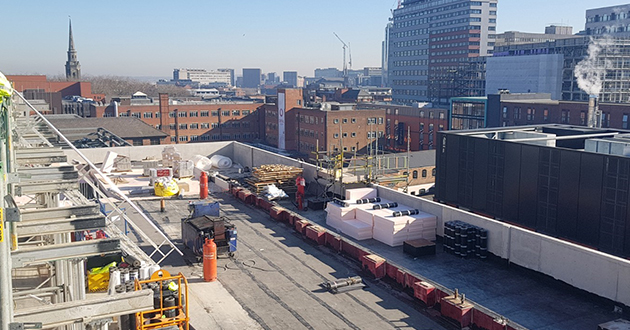 February 2019: After a freezing cold start, we saw temperatures jump into the teens – up on the roof looking out at Brum and blue skies.